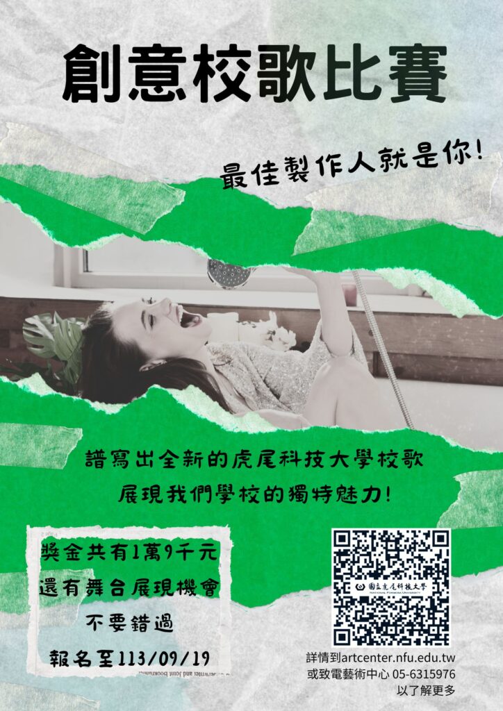 Dear students, now is the time to pour your love for your alma mater and your creativity into musical notes by joining the Creative School Anthem Competition. Use your one-of-a-kind melody to compose a brand-new anthem for National Formosa University and showcase the unique charm of our university!