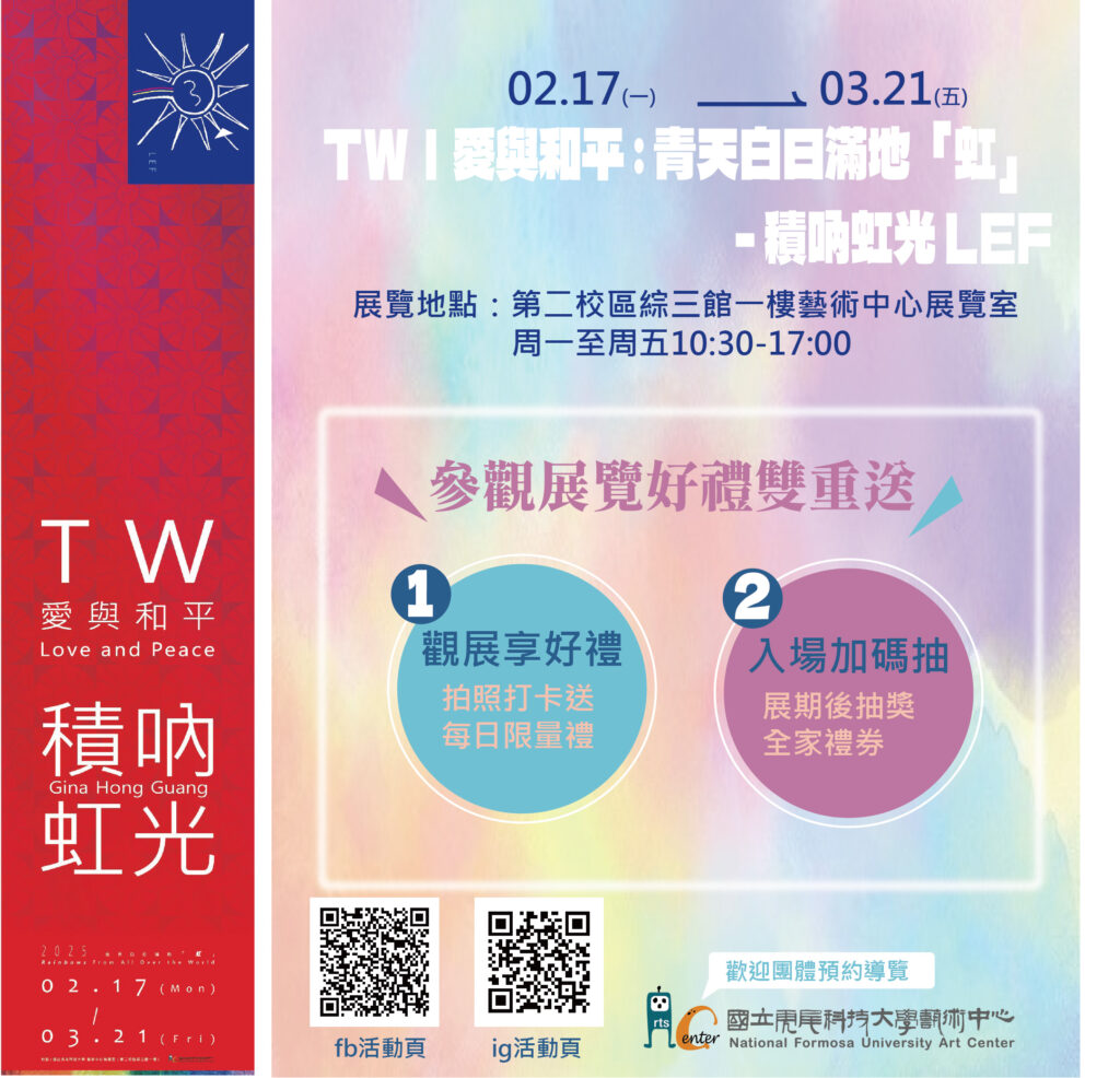 於展覽期間至藝術中心展覽室參觀展覽:【 TW|愛與和平 : 青天白日滿地「虹」】,進行拍照打卡上傳至「藝術中心ig或fb」的專屬活動留言處,即可憑手機社群平台畫面至藝術中心辦公室兌換看展小禮物一份 (贈品隨機贈送,每日數量有限換完為止)